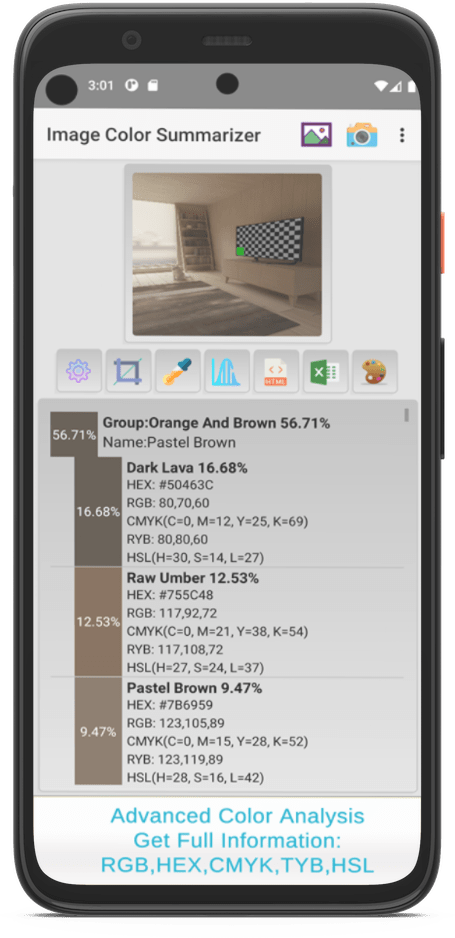 Image Color Summarizer extract the colors from any image and gives you full professional information such as: color name, color percentage, RGB, HEX, RYB, CMYK, HSL.